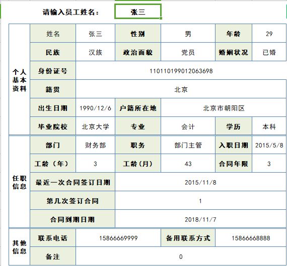 在这张表上,输入员工姓名,即可查询得出员工档案,方便快捷。