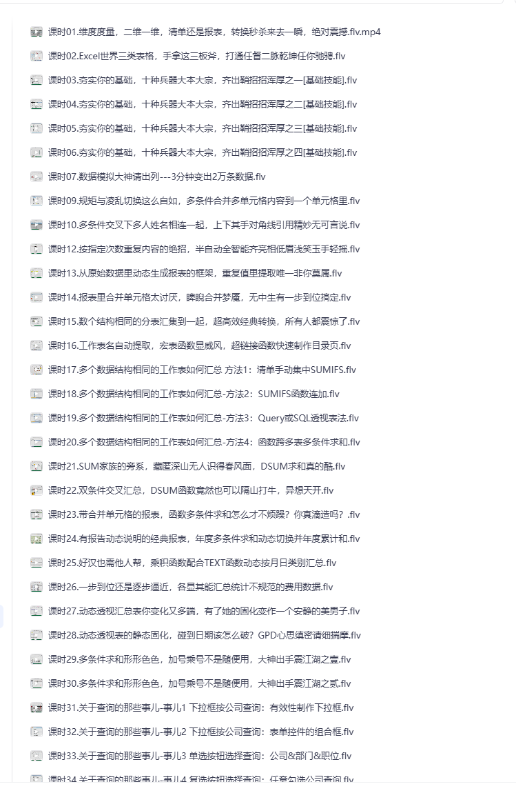 Excel视频教程包含维度度量、表格类型认知、基础技能(十种核心操作)、数据模拟(快速生成数据)、报表规范与灵活应用(多条件内容整合、姓名关联、按指定次数重复内容)、动态报表生成(原始数据生成报表、合并单元格处理、分表汇总)、工作表名提取与目录制作、多工作表汇总方法(SUMIFS函数、Query/SQL透视表法等)、SUM函数家族(DSUM函数应用)、多条件求和、查询功能制作(下拉框、表单控件等)等内容。