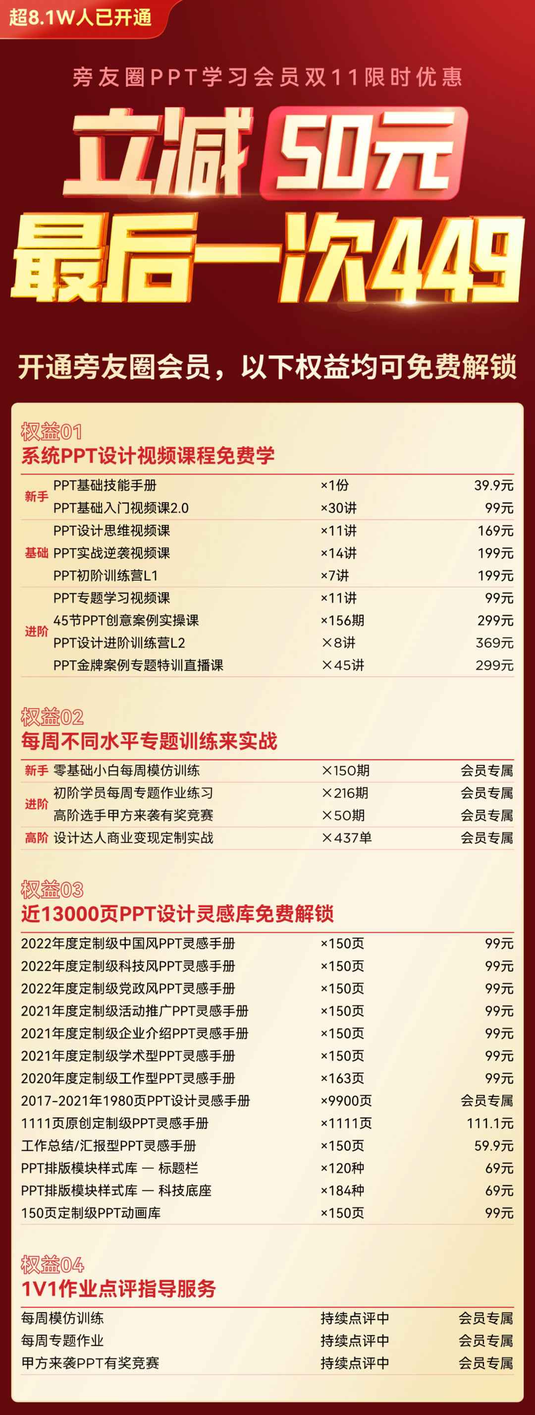 拿一个实际案例来看一下,比如像这个页面,这就是 PPT 里默认的表格样式:该咋优化呢?你要做的,就是减少线条,只保留横向的线条即可:接下来,在表格底部,添加一个圆角矩形的色块,搞定了。够简单吗?对于数字比较多的页面来讲,这个方法一样是通用的。比如像这样的一个页面:咋办呢?还是把所有的纵向线条去掉,只保留横向线条:为了在视觉上,对信息做一些规整,添加统一的圆角矩形色块,高级感出来了吧?对于产品介绍的 PPT 表格页,也是通用的,比如像这个页面:我们还是用一样的方法,先去掉原有表格的所有效果,只保留横向的线条:添加色块的目的,是对每一组的信息进行规整和区分,是不是够简单?当然,如果你想采用默认表格的样式,也是可以的,不过,尽可能地去掉线条,这是一个非常重要的点。咋办呢?只保留横向的线条,如果页面上的文字信息大于2行,那么,就让所有的文字,全部左对齐,看起来会更加整齐:接下来,进行视觉上的区分,可以添加两个不同颜色的色块,是不是就可以了?对于这个页面,还是先将信息将表格中,各种复杂效果全部去掉,只保留横向线条:对于上方的4个季节,你可以添加一个色块,进行区分:如果想做的有创意一点,也可以添加对应配图,进行区分,也是可以的:怎么样?我给你们总结的方法,是不是简单有效?你学会了吗?双11限时优惠,立减50元