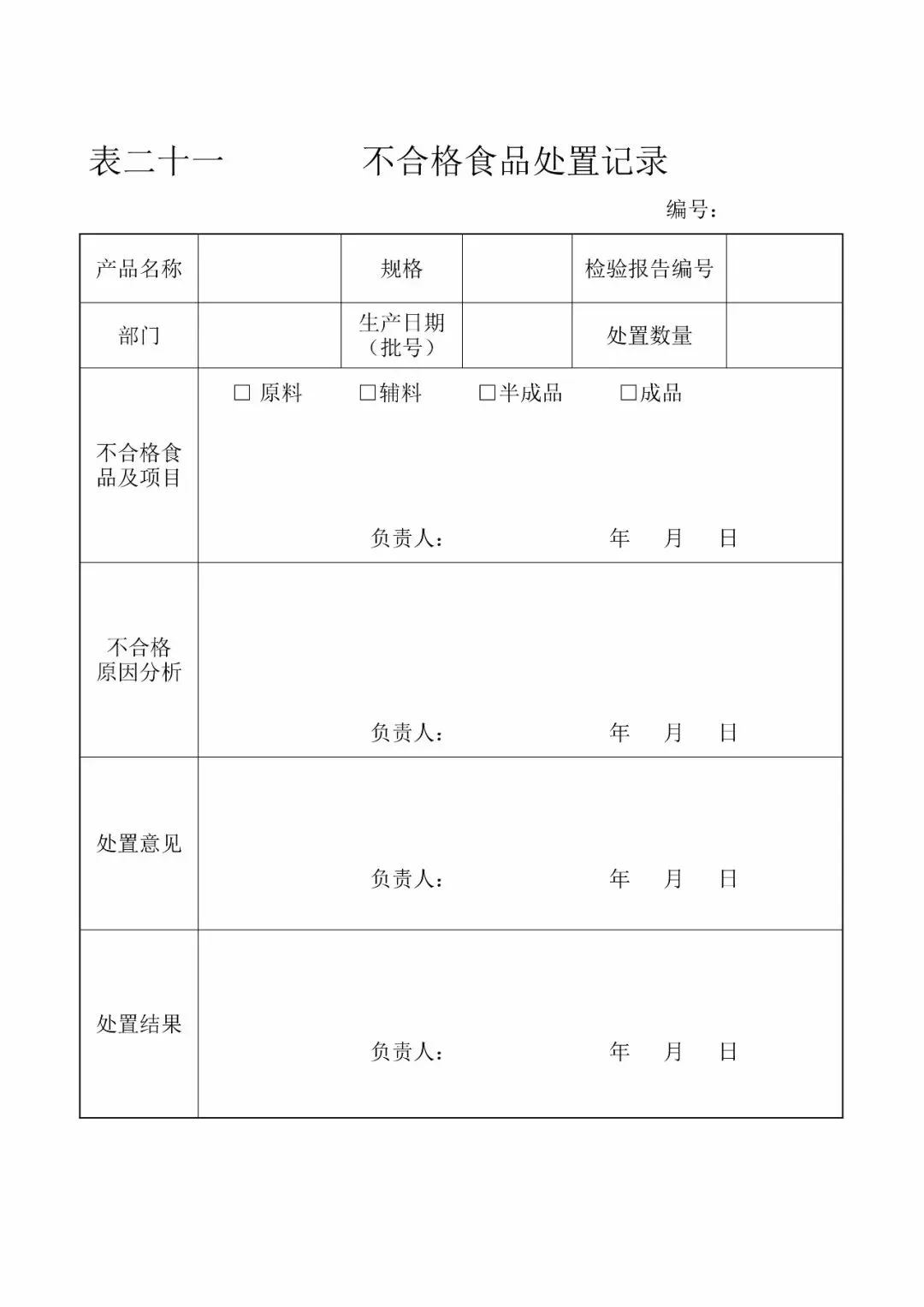 | 21、不合格食品(原辅料、半成品、成品)处置记录 |