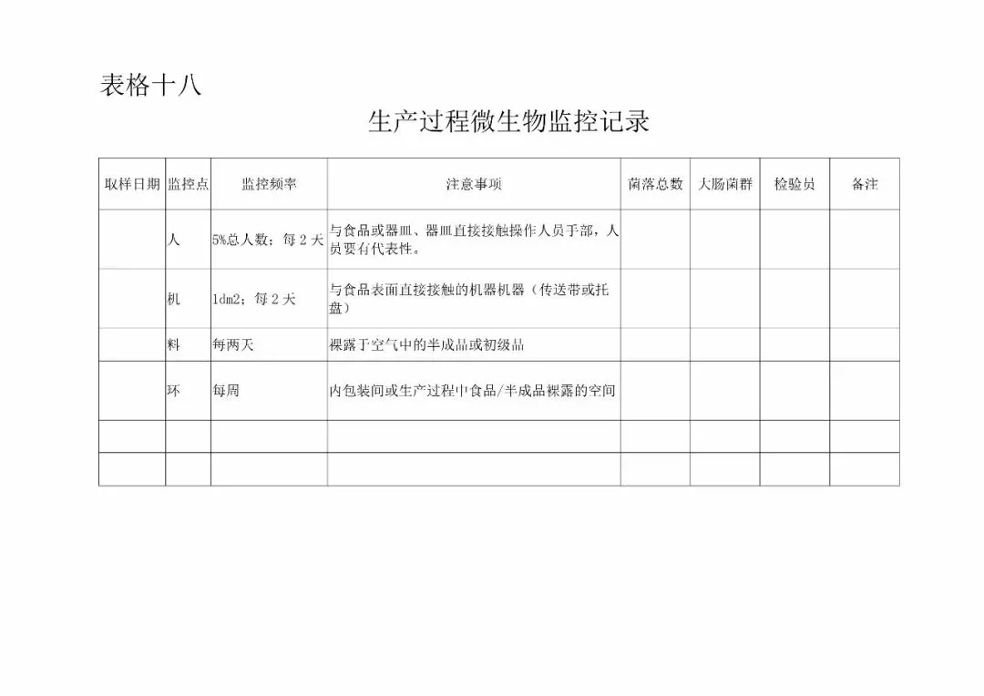 | 18、生产过程微生物监测记录(《GB14881-2013食品生产通用卫生规范》8.2) |