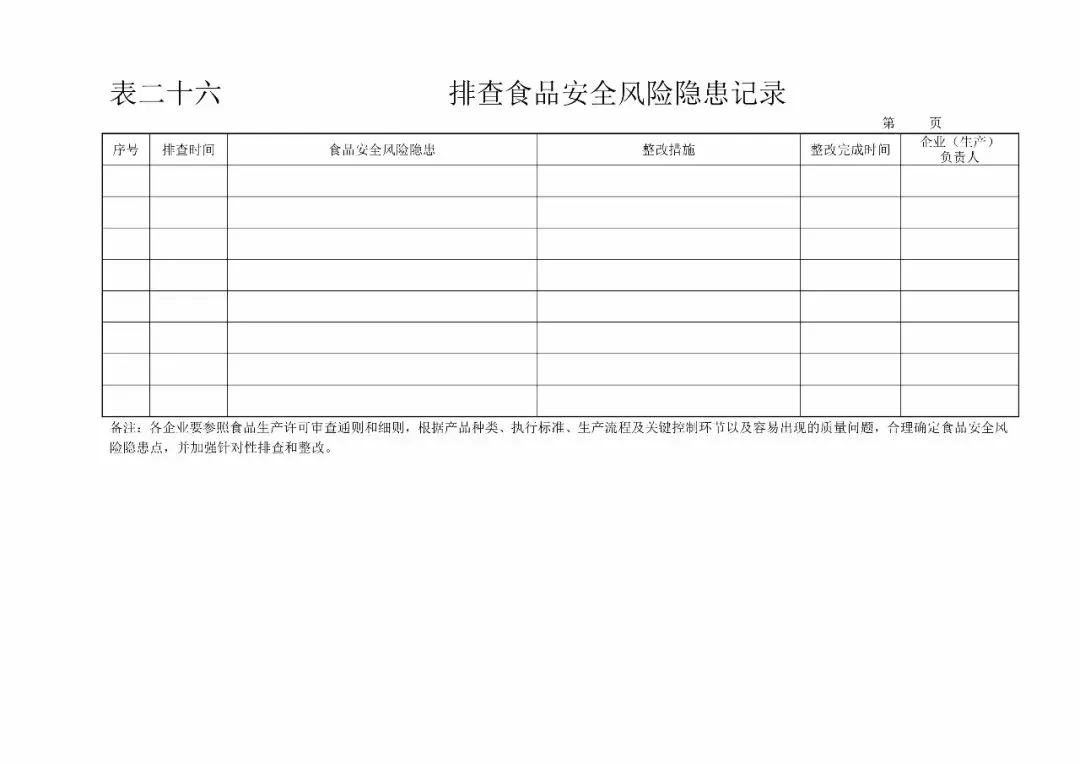 | 26、排查食品安全风险隐患记录(《食品生产日常监督检查要点表》8.1) |