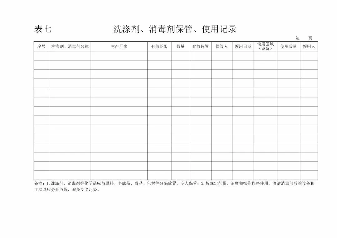| 7、洗涤剂、消毒剂使用记录(《食品生产日常监督检查要点表》1.6) |