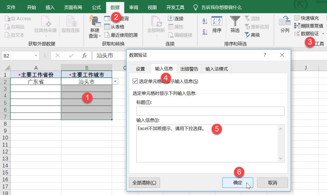 在数据验证,输入信息进行设置,比如提示:Excel不加班提示,请用下拉选择。又制作下拉菜单,又有文字提示,这样犯错的概率就很低。