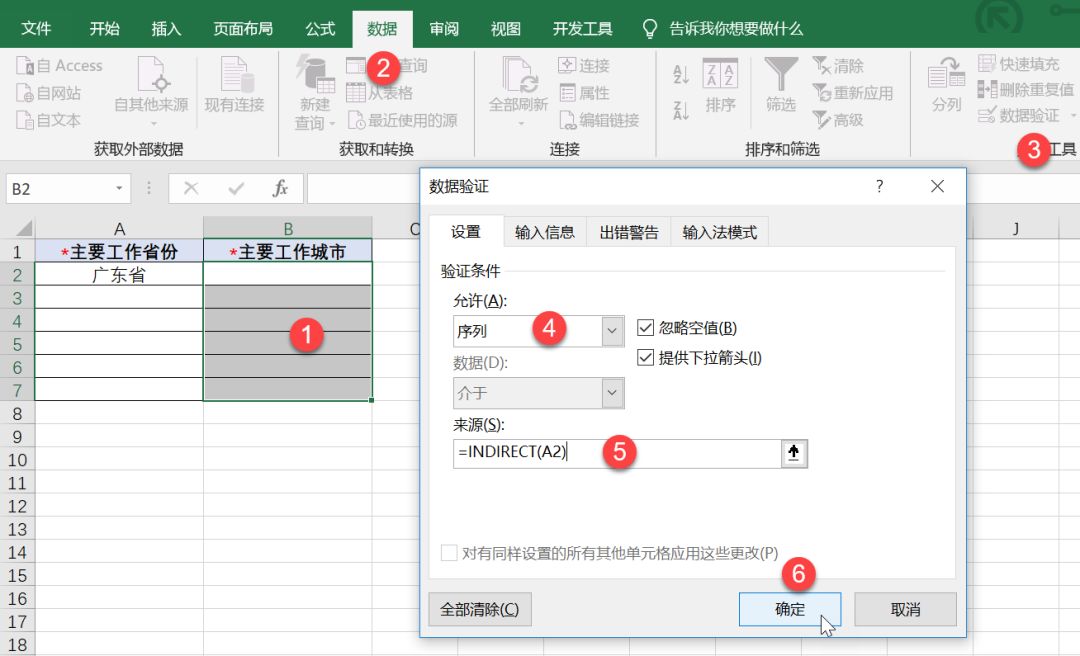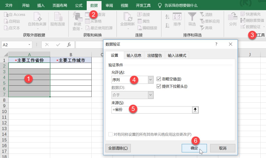 Step 05 选择省份的区域,点数据,数据验证(有效性),允许选择序列,来源输入=省份,确定。