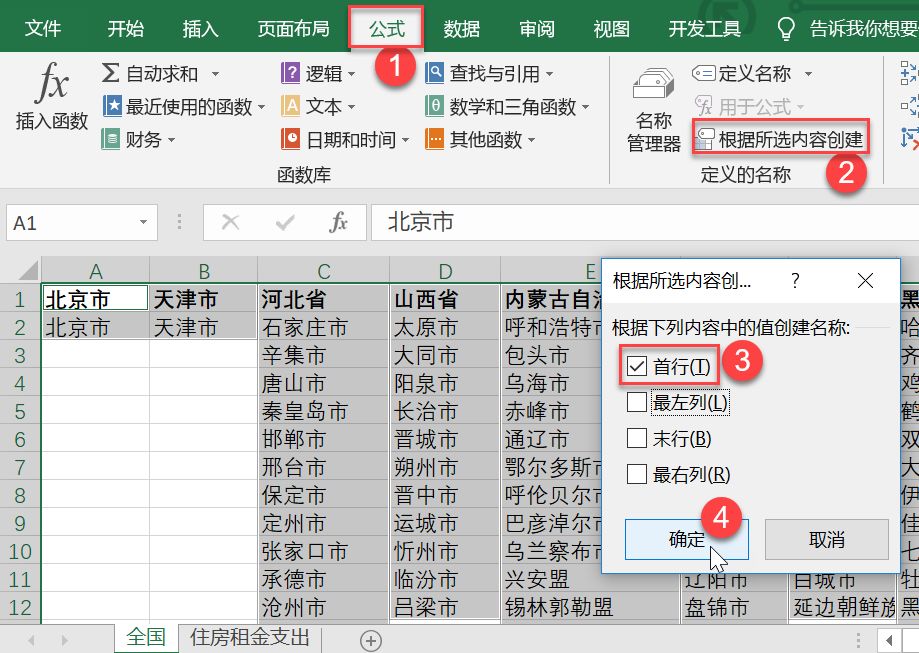Step 03 点公式,根据所选内容创建,只勾选首行,确定。