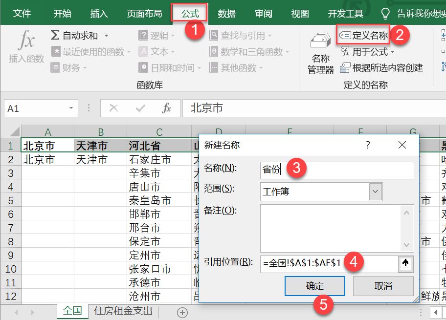 Step 04 点公式,定义名称,名称输入省份,引用全国第一行所有省份的区域,确定。