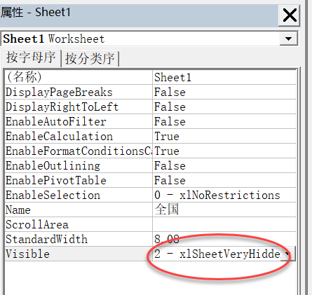 深度隐藏,是在VBA编辑器的后台设置的,按快捷键Alt+F11,将全国这个表,设置为2,也就是深度隐藏。普通的隐藏就设置为0,取消隐藏就设置为-1。