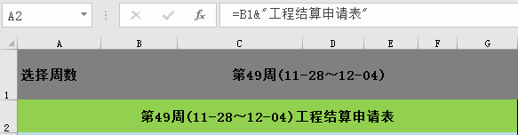 然后定位到A2单元格输入公式“=B1&"工程结算申请表"”,即将B1的内容和周报名称组合在一起。