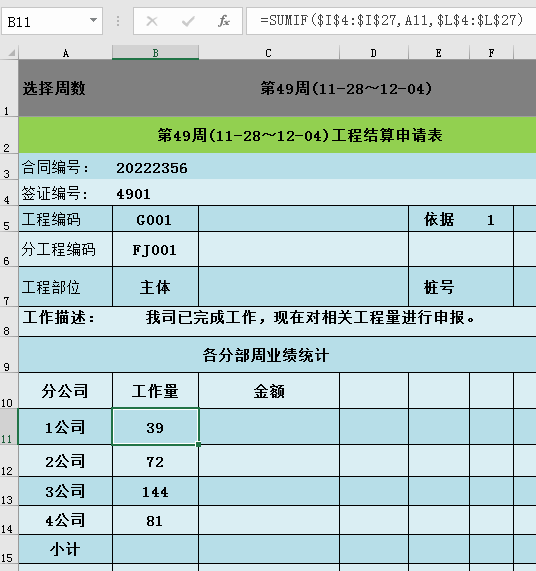 定位到B11单元格输入公式“=SUMIF($I$4:$I$27,A11,$L$4:$L$27)”,向下填充完成各分公司周工作量数据统计。