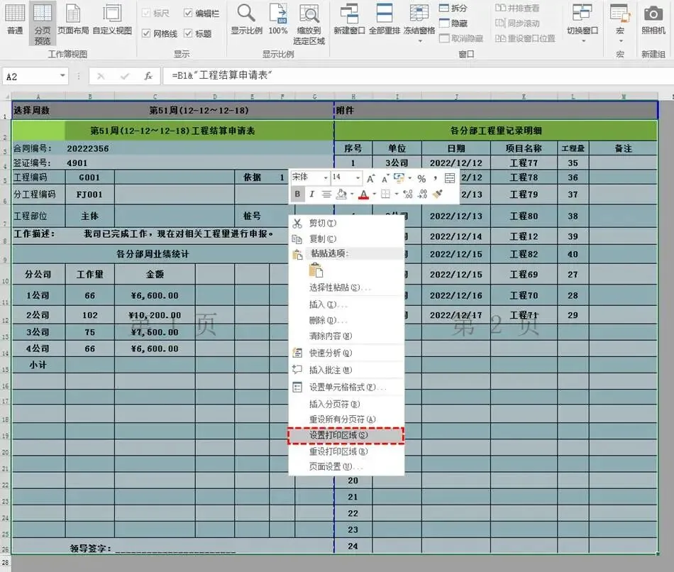 删除多余空白页后,在区域内选中A2:M26,右击选择“设置打印区域”,将第一行数据排除在打印区域之外。