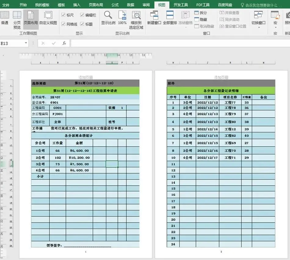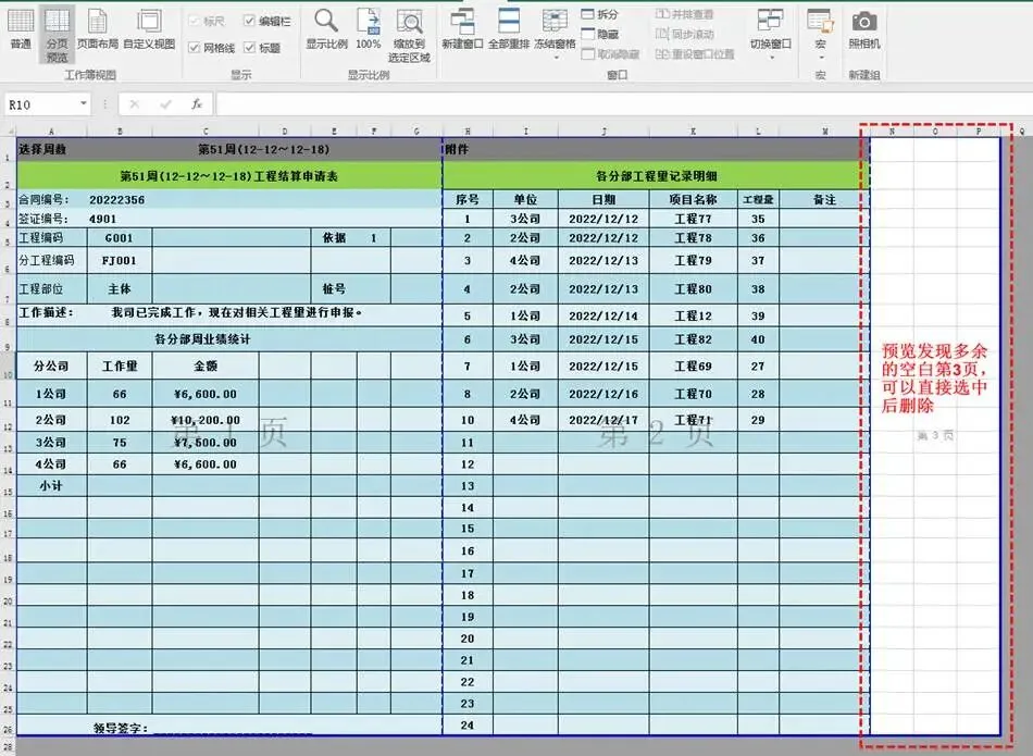 根据公司的要求,周报表控制两个页码。点击“视图→分页预览”,检查是否刚好只有两页。如果有多余空白页面,譬如第3页,这时,可以直接选中这一页,然后按Delete键删除。