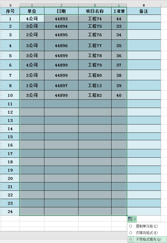 接着将公式向下、向右填充,这样通过数组公式,就可以将符合要求的周次数据依次提取到I4:L24区域中。注意下拉后单击“自动填充项”,选择“不带格式填充”,避免设计好的表格格式别修改。