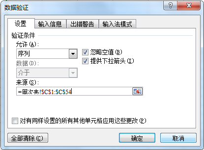 然后定位到B1单元格,点击“数据→数据验证”,在“验证条件”选择“来源”,来源数据选择“=周次表!$C$1:$C$54”。