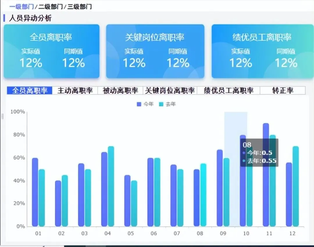 假如你是一名人事,你需要在报表中展现本周在职人员多少、离职人员多少,离职率多少,同期降低多少等,通过数据和图表一目了然,避免了大量的数据、文字对其描述,领导也能很快的抓住周报重点。