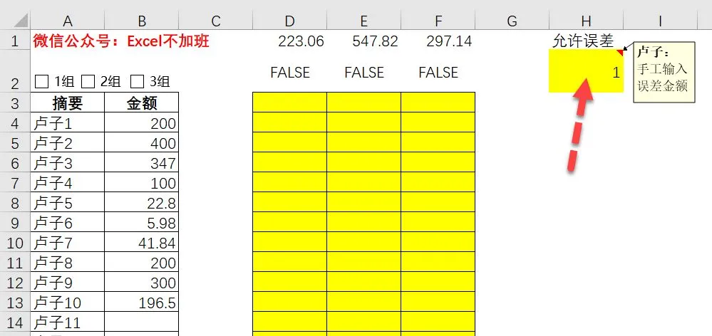 先在H2手工输入允许误差的金额,比如1。