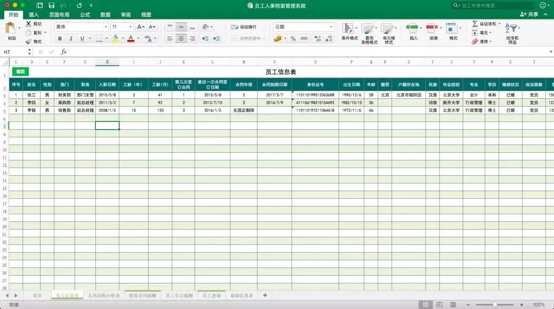 根据员工信息表内容,会自动生成人员结构分析表,包括学历、性别、部门、年龄、工龄等信息。