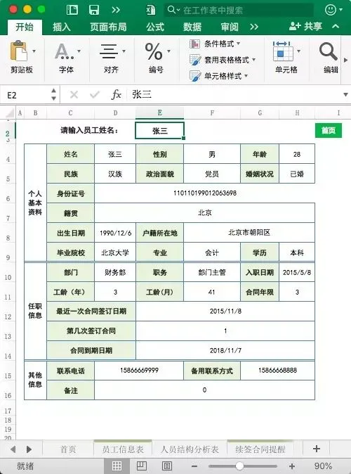 在这张表上,输入员工姓名,即可查询得出员工档案,方便快捷。