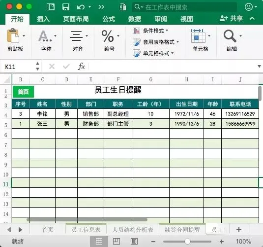 对于有员工生日福利的企业,这张表就很有作用了,会自动提取即将生日的员工名单,帮助HR提前做好安排。