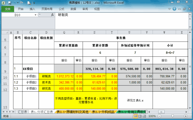 针对“外场试验和野外作业项目的人员差旅费,及试验相关物品所需运输费和装卸费”,小编在汇总表中单独设置了“单独计列”栏,并通过两张明细表(表6.1-事务费1和表6.2-事务费2)进行汇总测算;