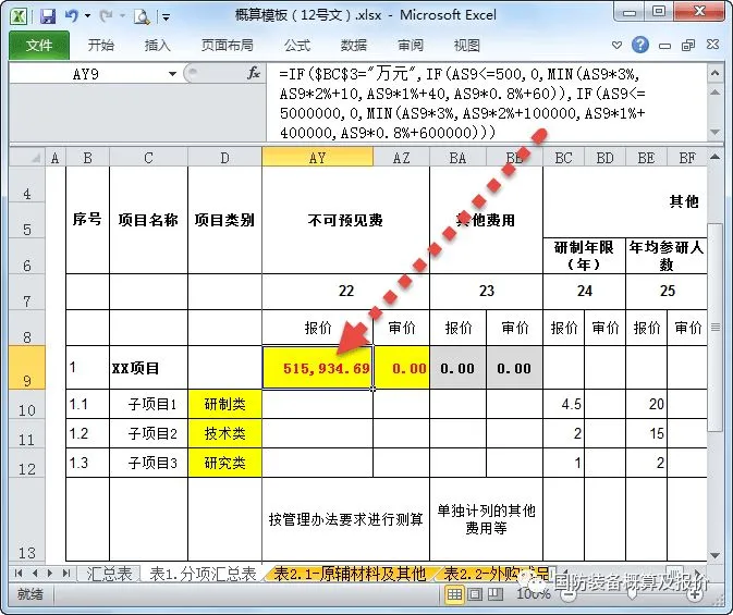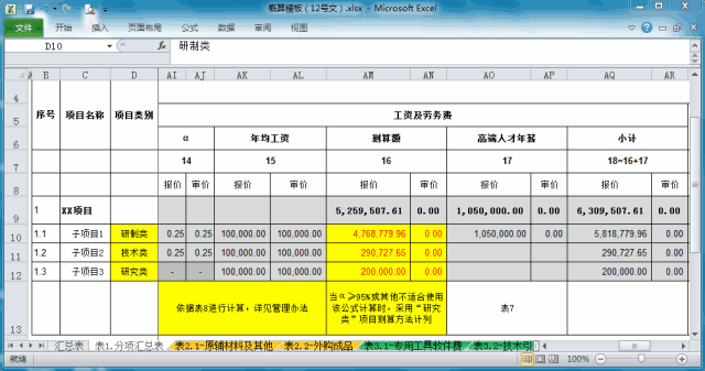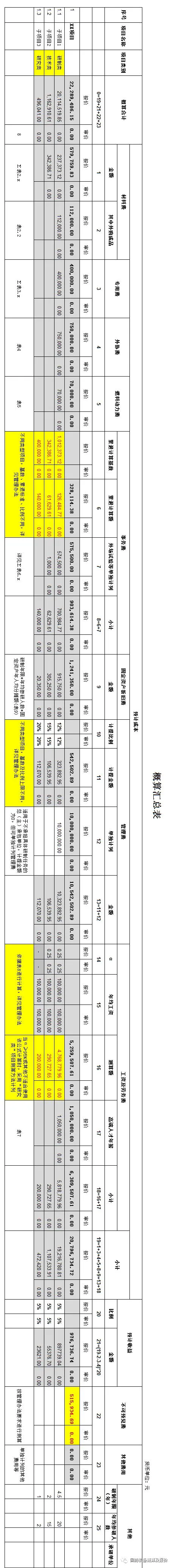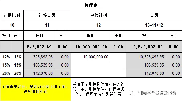 另外,“表1.分项汇总表”的管理费栏目中,小编还为大家提供了一栏“单独计列”项(在个别项目中,承研单位无其他成本,按前述成本基数乘计提比例的方式,测算额为0,但希望单独计列一笔管理费,可填列在此);