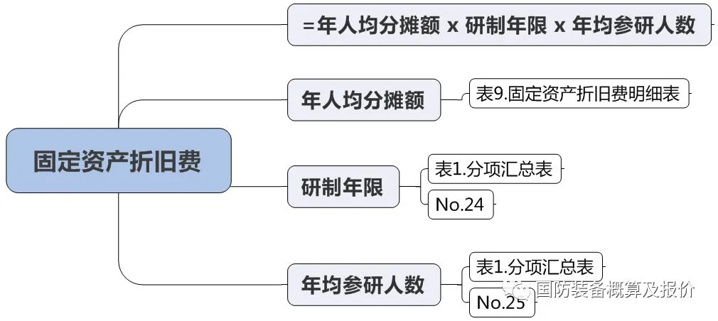 固定资产折旧费 = 年人均分摊额 x 研制年限 x 年均参研人数;
