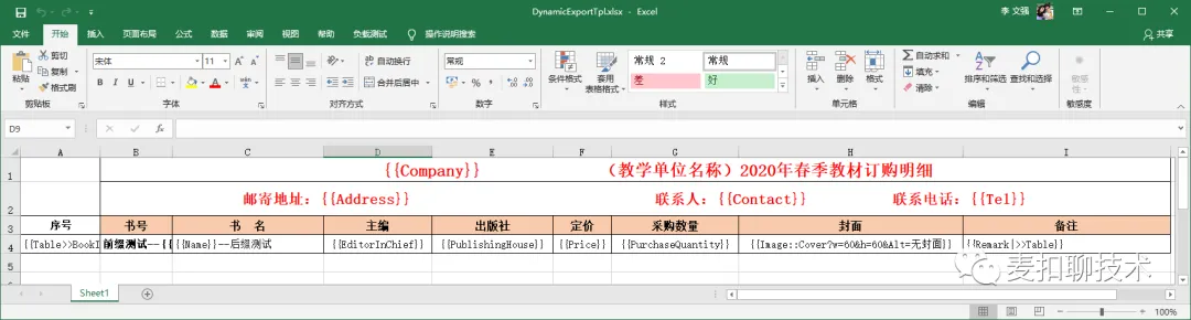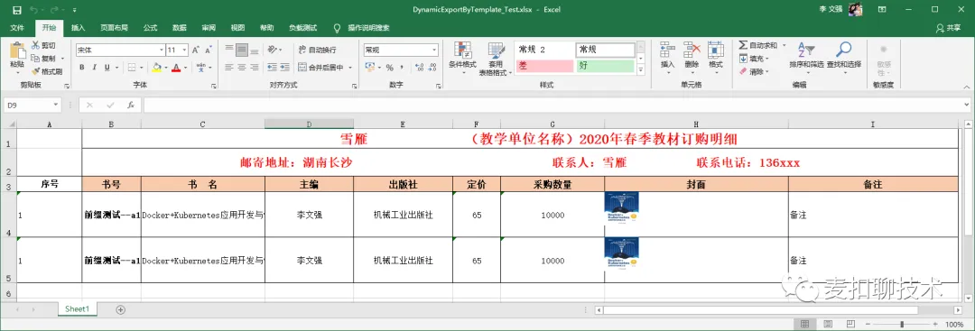 dynamic data = new ExpandoObject();data.Company = "雪雁";data.Address = "湖南长沙";data.Contact = "雪雁";data.Tel = "136xxx";data.BookInfos = new List<ExpandoObject>() { };dynamic book1 = new ExpandoObject();book1.No = "A1";book1.RowNo = 1;book1.Name = "Docker+Kubernetes应用开发与快速上云";book1.EditorInChief = "李文强";book1.PublishingHouse = "机械工业出版社";book1.Price = 65;book1.PurchaseQuantity = 50000;book1.Cover = "https://img9.doubanio.com/view/ark_article_cover/retina/public/135025435.jpg?v=1585121965";book1.Remark = "买买买";data.BookInfos.Add(book1);dynamic book2 = new ExpandoObject();book2.No = "A2";book2.RowNo = 2;book2.Name = "Docker+Kubernetes应用开发与快速上云";book2.EditorInChief = "李文强";book2.PublishingHouse = "机械工业出版社";book2.Price = 65;book2.PurchaseQuantity = 50000;book2.Cover = "https://img9.doubanio.com/view/ark_article_cover/retina/public/135025435.jpg?v=1585121965";book2.Remark = "买买买";data.BookInfos.Add(book2);//模板路径var tplPath = Path.Combine(Directory.GetCurrentDirectory(), "TestFiles", "ExportTemplates", "DynamicExportTpl.xlsx");//创建Excel导出对象IExportFileByTemplate exporter = new ExcelExporter();//导出路径var filePath = Path.Combine(Directory.GetCurrentDirectory(), nameof(DynamicExportWithExpandoObjectByTemplate_Test) + ".xlsx");if (File.Exists(filePath)) File.Delete(filePath);//根据模板导出await exporter.ExportByTemplate(filePath, data, tplPath);