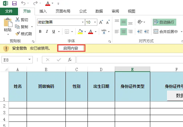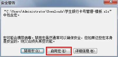 第三步:双击打开导入模板Excel,在弹出的“安全警告”窗口中选择“启用宏”(若是通过导入模板启用宏,需关闭后再次打开方可生效)。