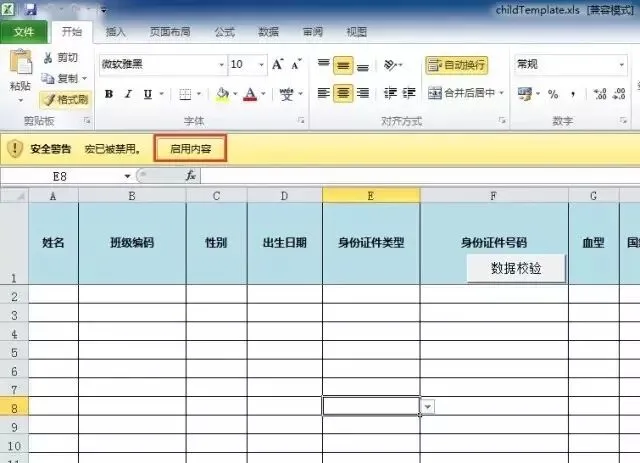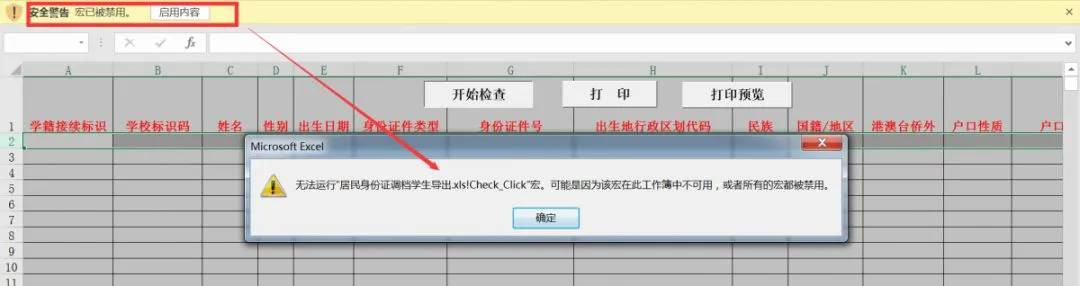 全国学籍系统中的学籍注册模板必须启用Excel宏,否则将无法使用模板数据校验功能,最好使用Microsoft(微软) Excel打开模板。在电脑上第一次打开模板时,会有启用宏提示,若不提示则表示宏设置选择了“禁用所有宏,并且不发通知”。点击“开始检查”按钮验证模板数据校验是否有效,若未启用宏,模板会有如下图所示错误▼▼▼(点击图片可放大)