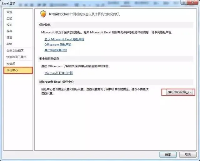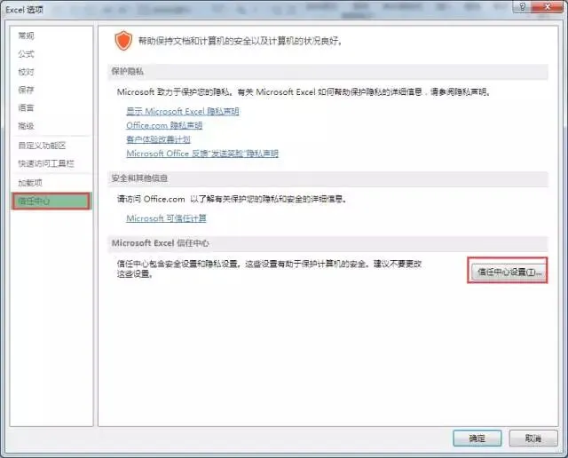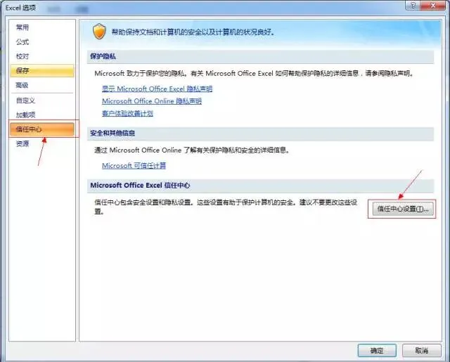 第三步:在弹出的对话框一次选择【信任中心—>信任中心设置】;