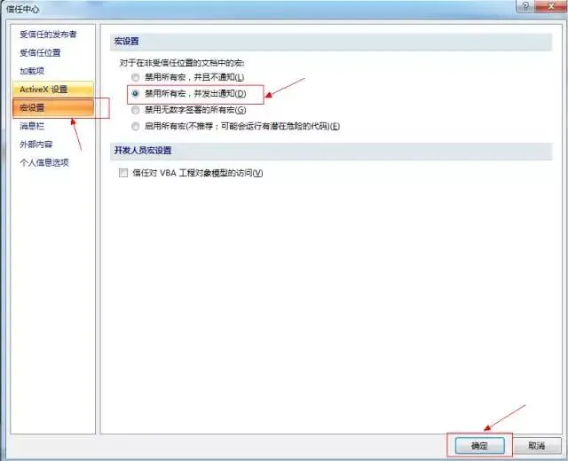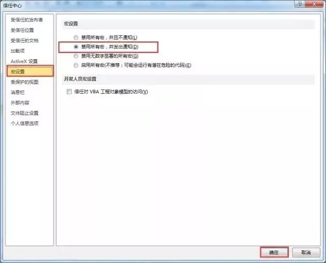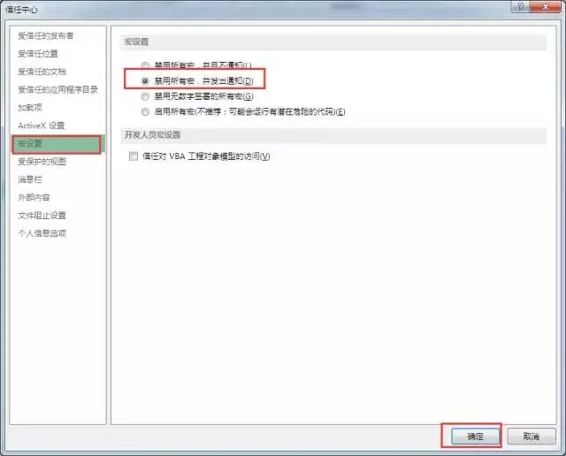 第四步:在弹出的的对话框依次选择【宏设置—>禁用所有宏,并发出通知】,点击“确定”按钮;
