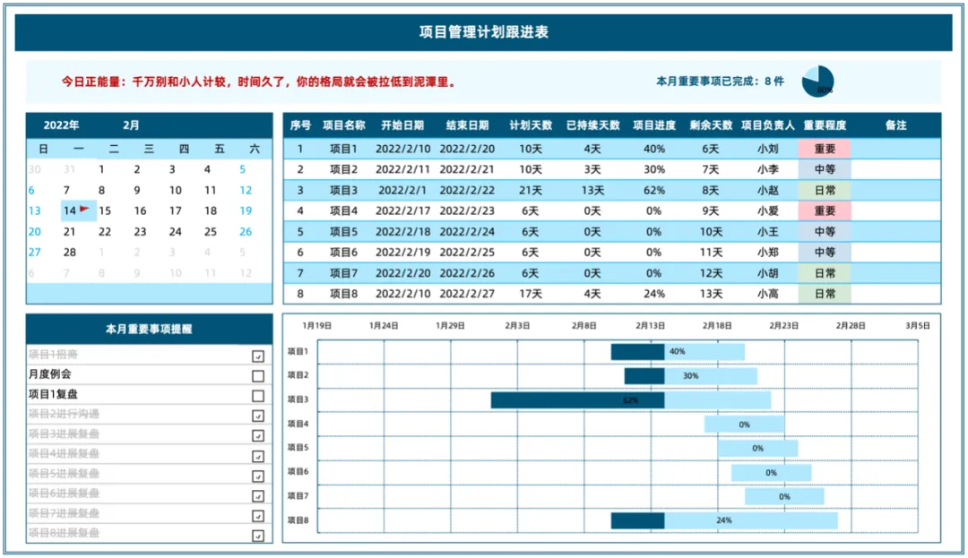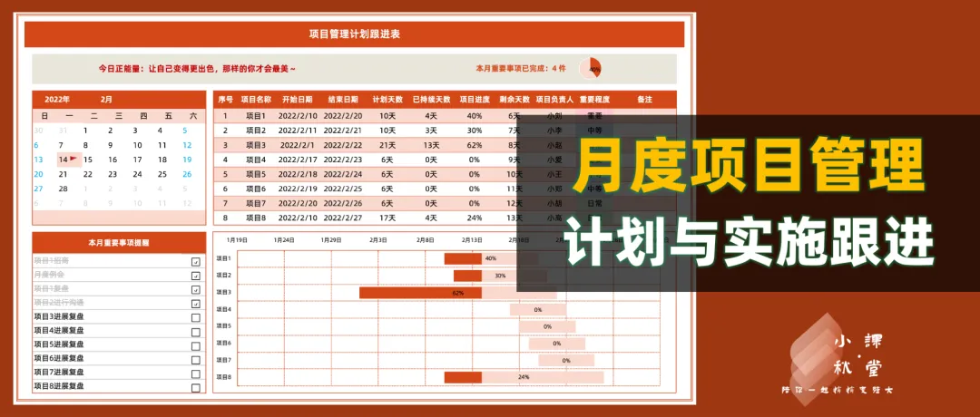 一份关于月度项目管理的Excel模版,便于更合理的规划及跟进本月项目达成情况。