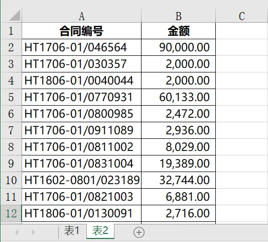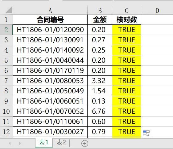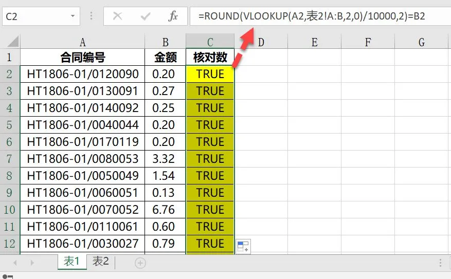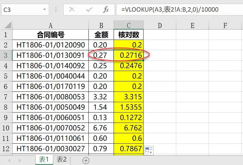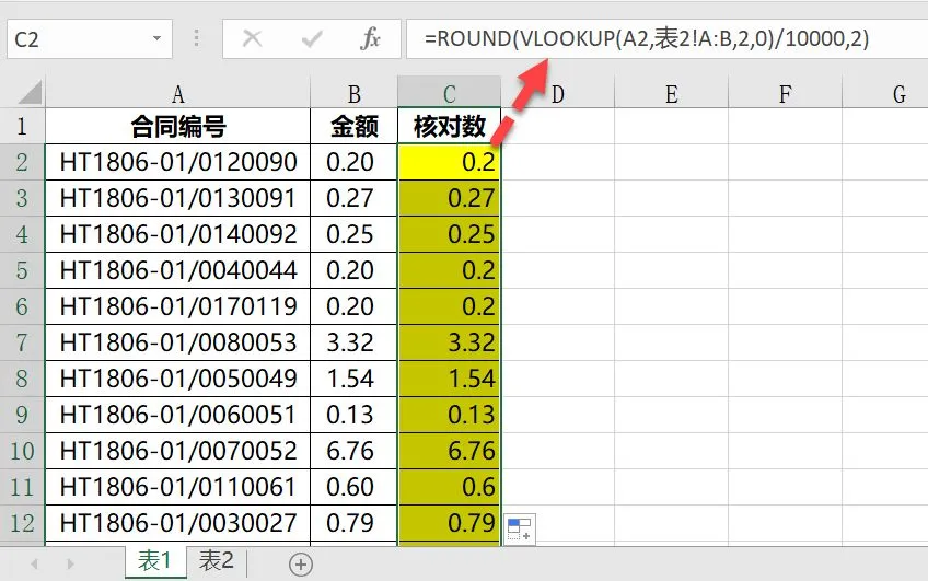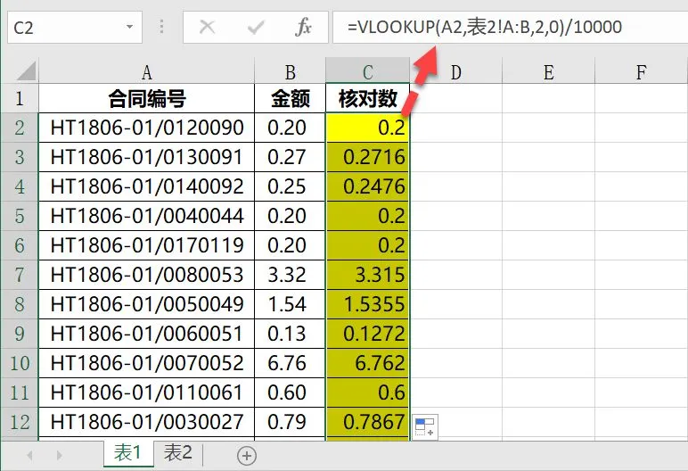 学员问题:表1的金额是以万为单位,表2的金额是以元为单位,现在要根据合同编号核对金额是否一致。
