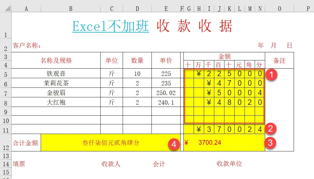 学员的问题,在设置收款收据Excel模板,想要得到黄色区域4个公式。