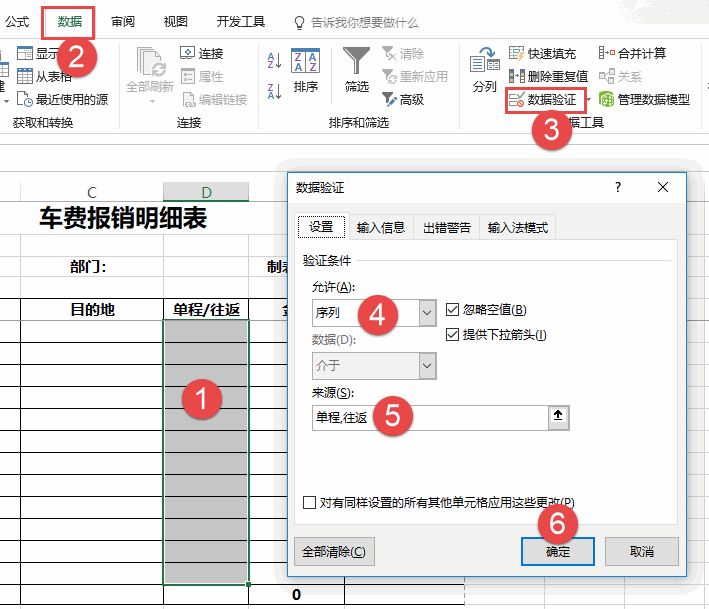 4.D列单程/往返,防止乱输入,设置下拉菜单。