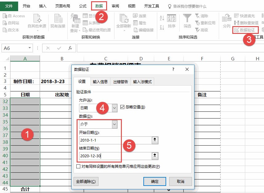 选择区域A6:A44,单击数据→数据验证(低版本叫数据有效性),允许选择日期,设置日期介于2010-1-1到2020-12-30之间。