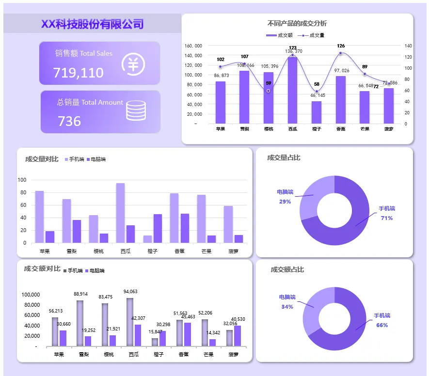 通过以上数据源,结合咱们课堂上所学的Excel知识,制作出以下分析看板。大家拿到这份看板,只需要将数据修改为自己所需的,就可以自动更新。