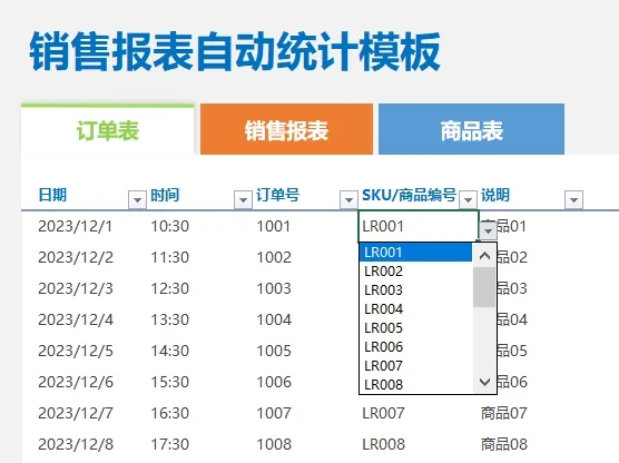 订单表的sku支持下拉列表选择,数据源来自商品表的sku列表,在商品表中更新sku后,订单表的下拉菜单列表自动更新。