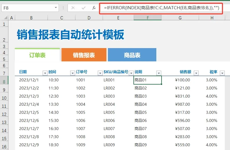 =IFERROR(INDEX(商品表!C:C,MATCH(E8,商品表!B:B,)),"")
