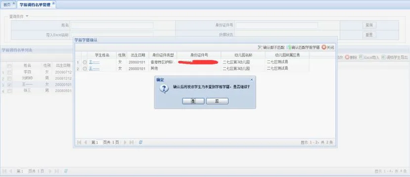 注意:处理状态为已匹配学前学籍和未查到学前学籍的学生可直接导出,处理状态是待确认学前学籍的,必须先确认一条匹配信息或者确认都不匹配,才可导出。如下图▼该图展示的是选择确认都不匹配。