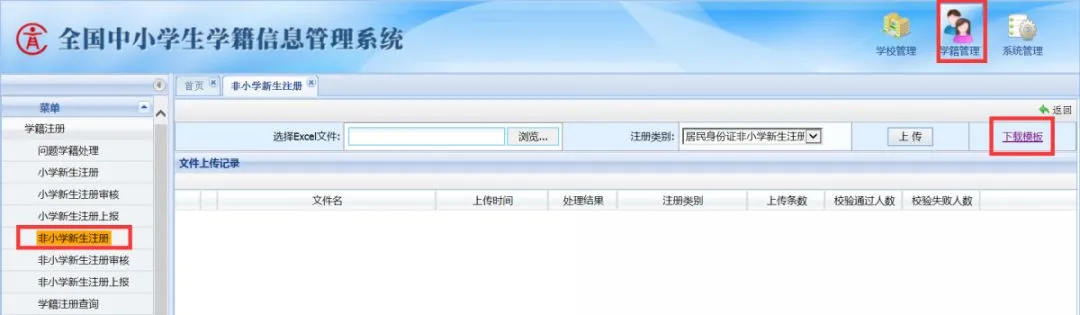未开展学前接续的省份,学校学籍管理员可依次点击:学籍管理->学籍注册->小学新生注册,点击导入直接下载相应模板。