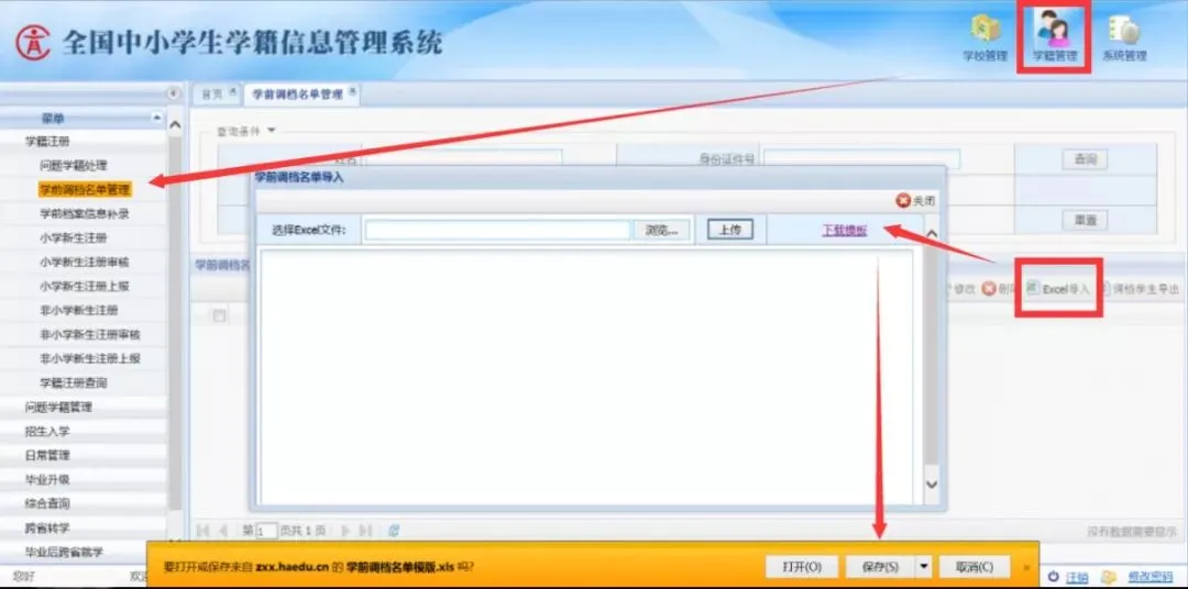 操作菜单:学校学籍管理登录学籍系统,依次点击:学籍管理->学籍注册->学前调档名称管理->EXCEL导入->浏览->上传,如下图所示▼