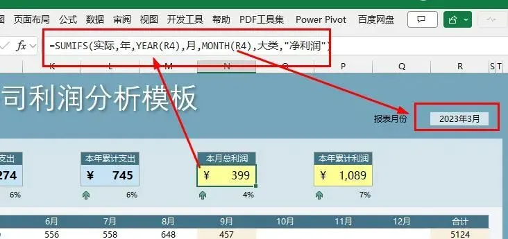 =SUMIFS(实际,年,YEAR(R4),月,"<="&MONTH(R4),大类,"净利润")