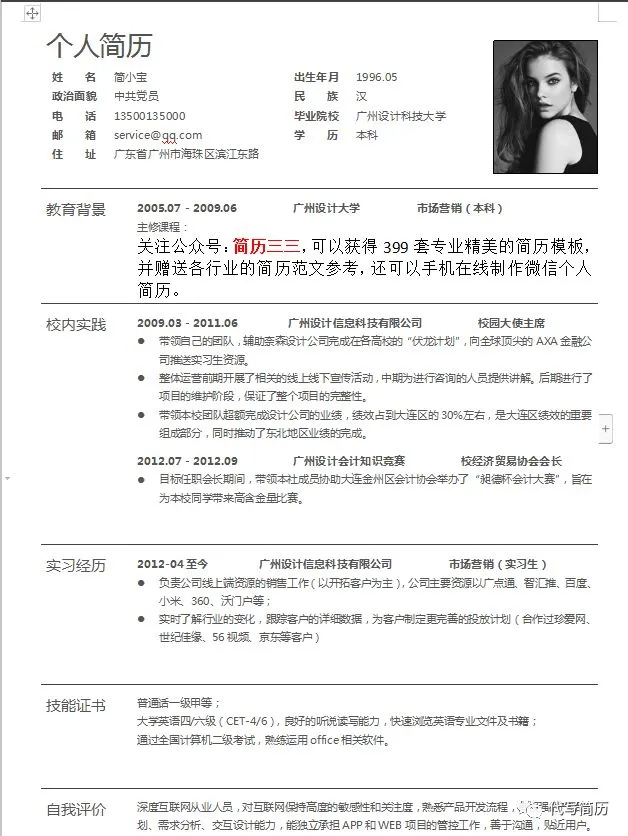 简历三三,不仅能免费领取标准通用的个人简历表格模板,还能手机微信制作简历表格,做好的简历可以发给微信好友,还能转成PDF文件发送到邮箱,非常方便。
