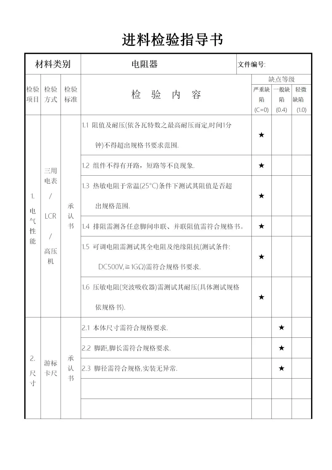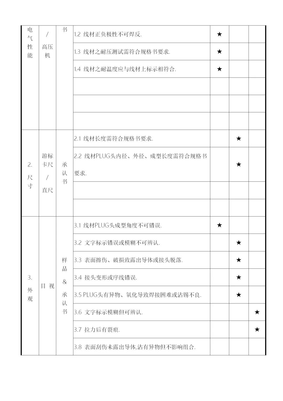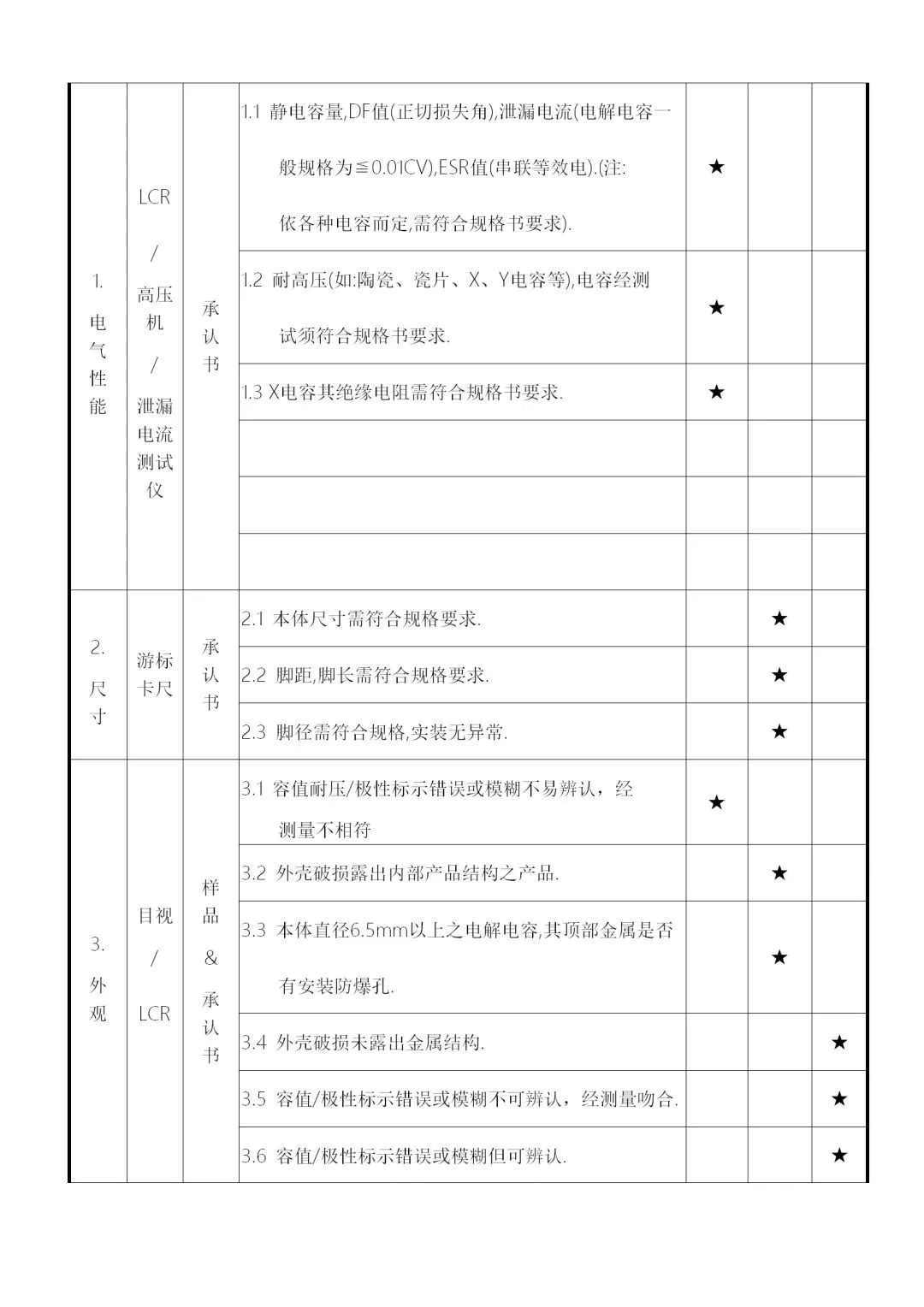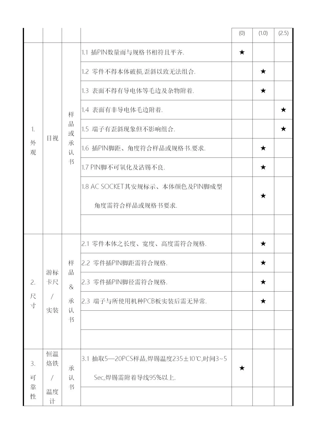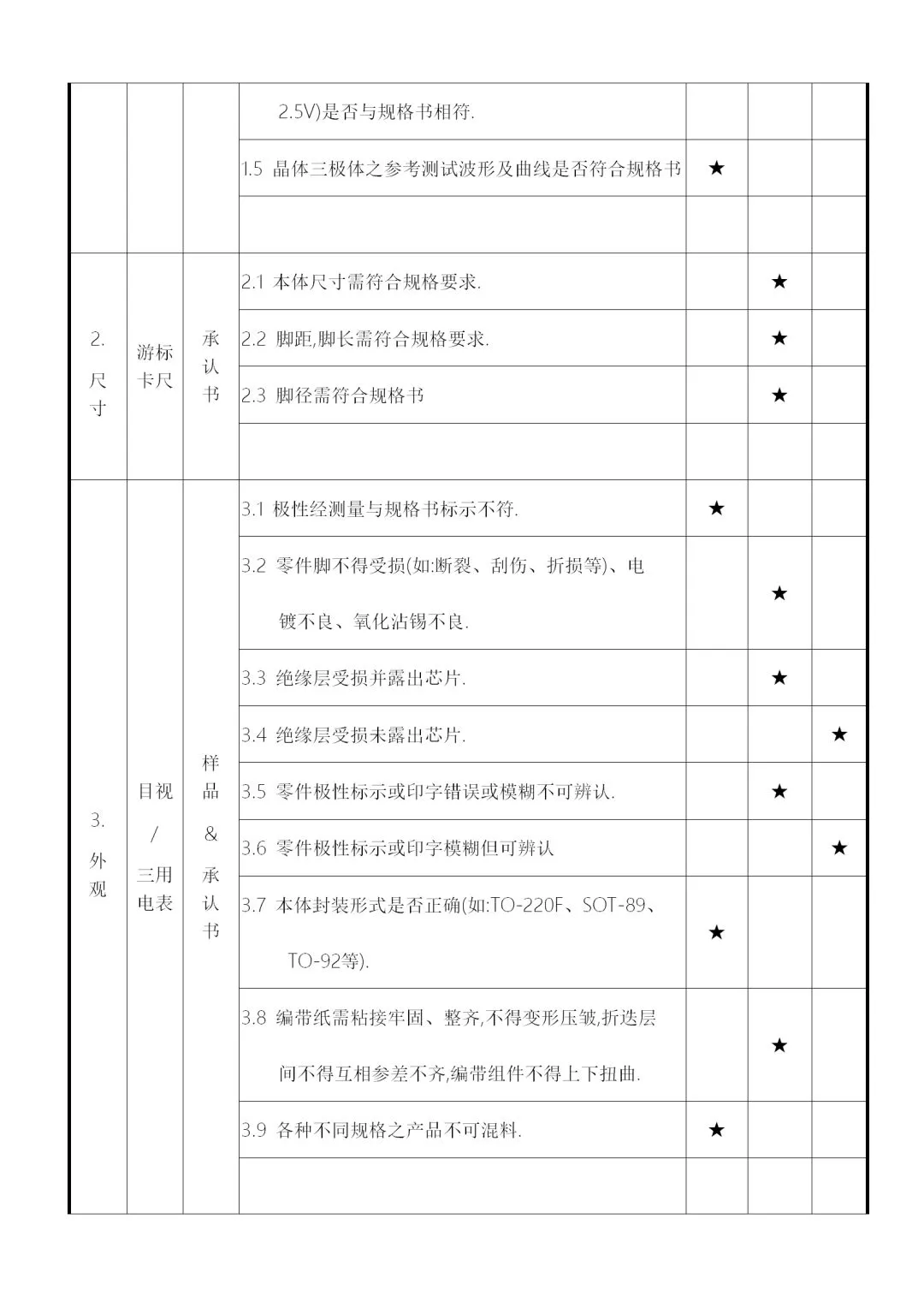 2、供料厂商的品质信赖度及物料的数量、单价、体积等,加以规划为全检、抽检、免检,要求如下: