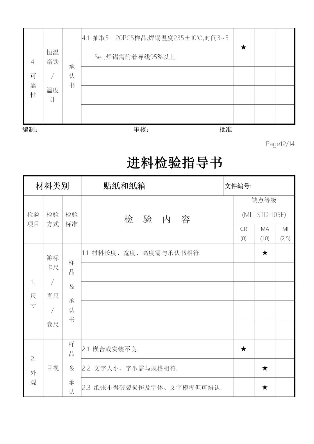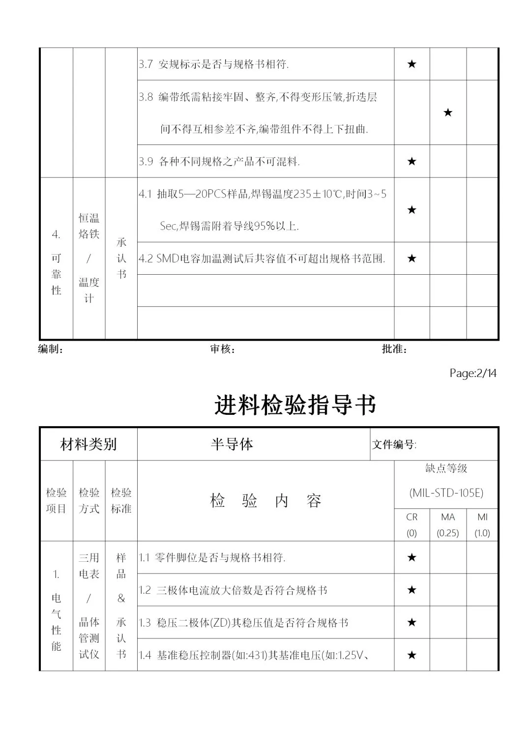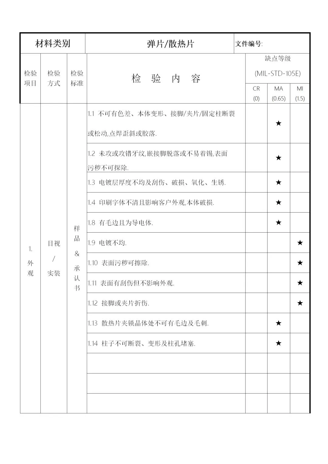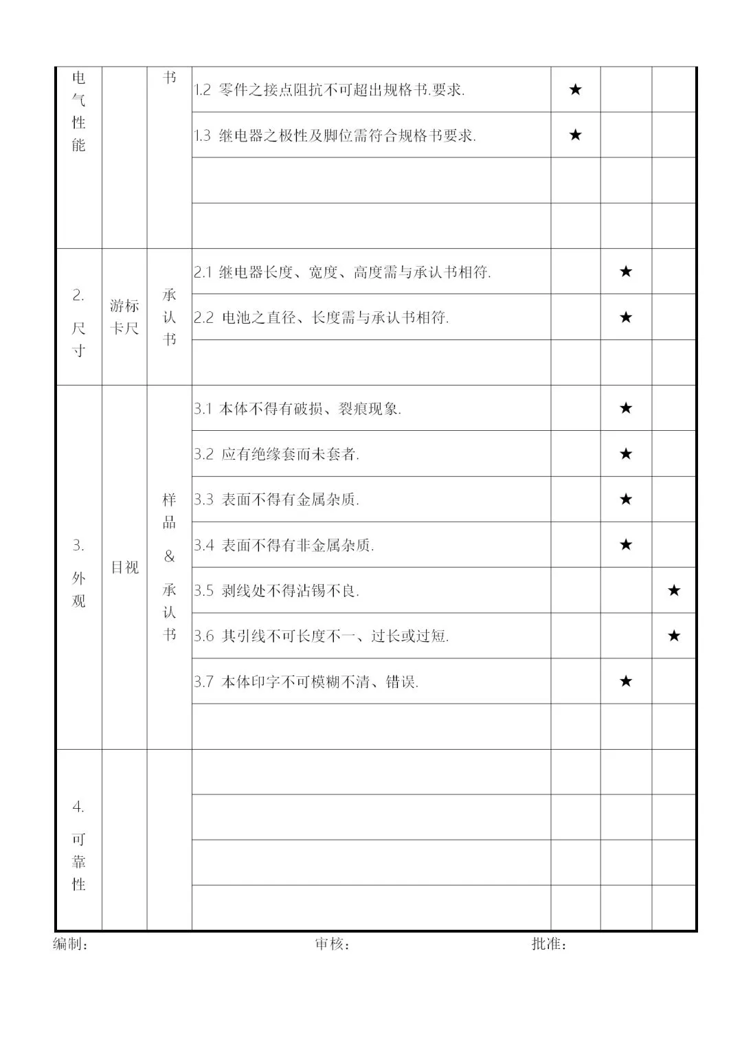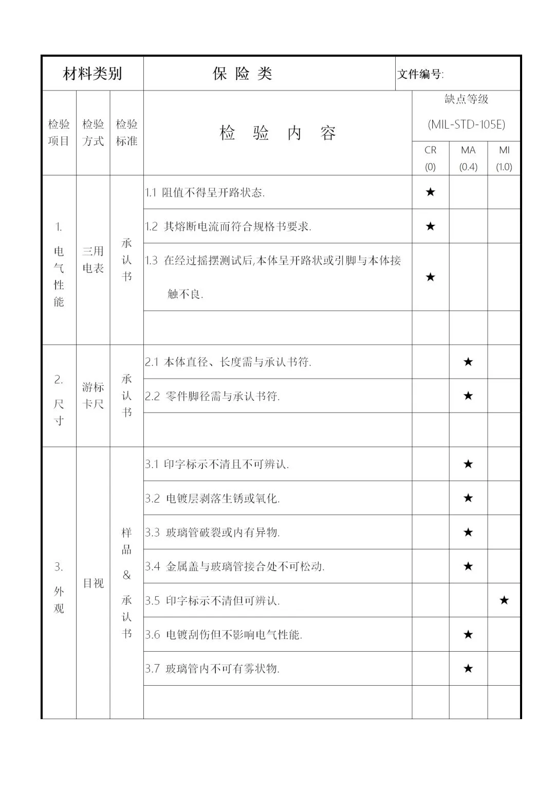 2、供料厂商的品质信赖度及物料的数量、单价、体积等,加以规划为全检、抽检、免检,要求如下: