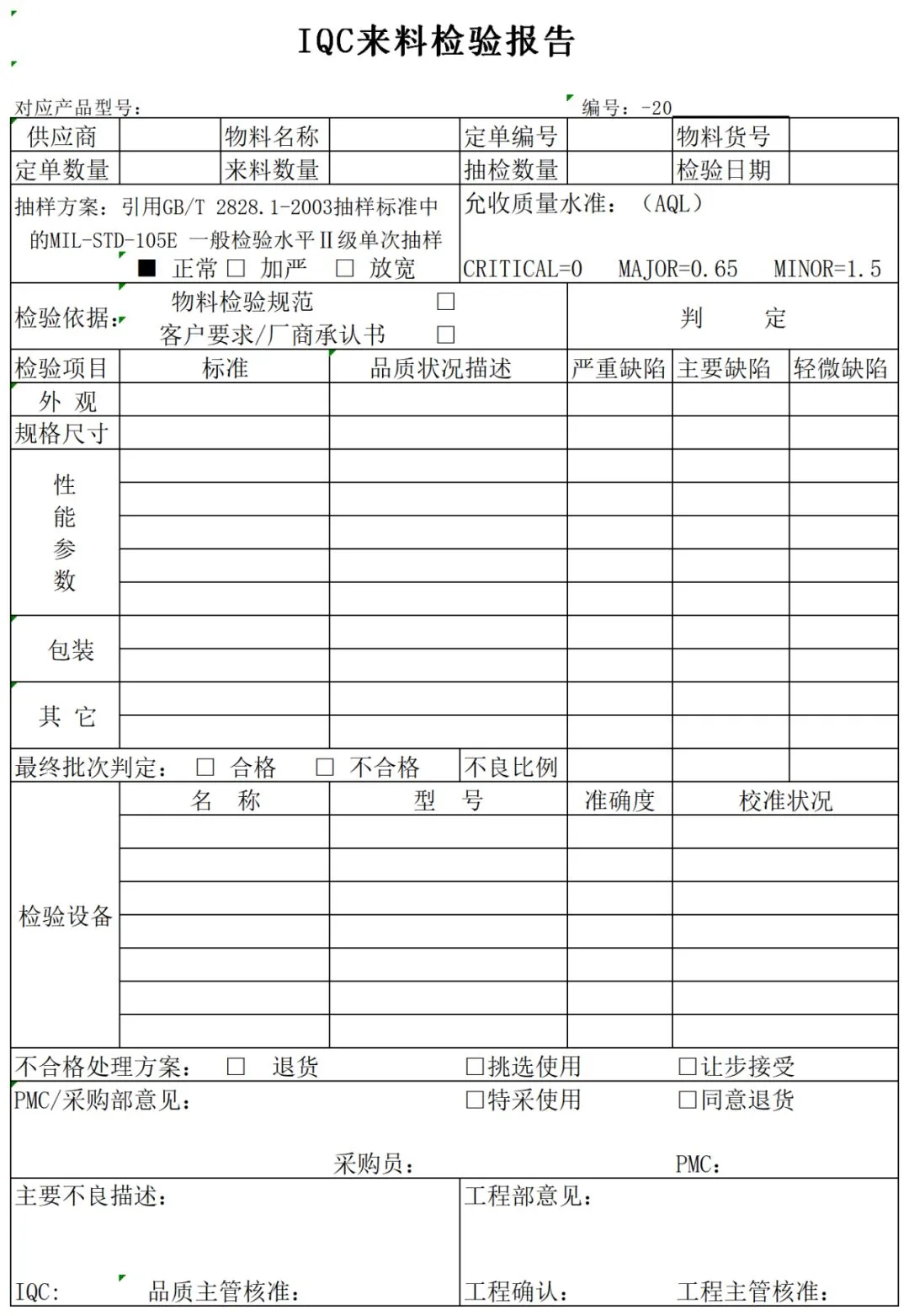 下面是情报君收集的一些IQC来料检验常用的表格,如来料检验指导书、来料检验报告、检查报表等,下载方式获取如下: