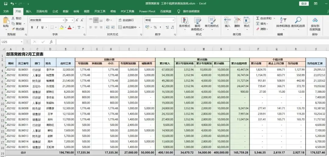 (扫上面图片二维码,加入微信群学习)2021年起,个税扣缴有新调整,由此导致之前的Excel个人所得税计算公式也需要进行相应调整。因此,邀请咱们部落窝教育财务Excel课程的主讲老师,为大家开发了最新的Excel2021年工资个税模板,大家下载之后,只需要修改相应工作表单元格的数据,就可以自动得到结果。 表格中,详细的罗列了专项扣除、累计扣除、个税计算等等。其中个税计算,又包含了累计应缴、截止上月已缴、当月应缴……从Excel技术层面来说,2021年个人所得税计算公式,包含了SUMIFS函数、COUNTIF函数、SUMPRODUCT函数、INDIRECT函数等等的使用,还使用到了VBA代码。 如果你也想要这份工资个税模板,请到QQ群:904317573下载。如果您没有QQ,也可以添加老师微信发送。微信号:blwjymx