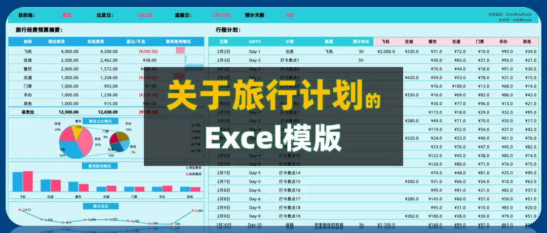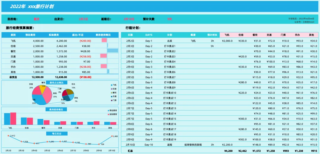 之前每次旅行前,都会用小本本做行程计划,但往往只是简单做个计划,旅行结束后想做个小总结,很多细项早已记不清。于是开发了这份Excel模版,不仅记录清晰了很多,后续查找也很方便哦~