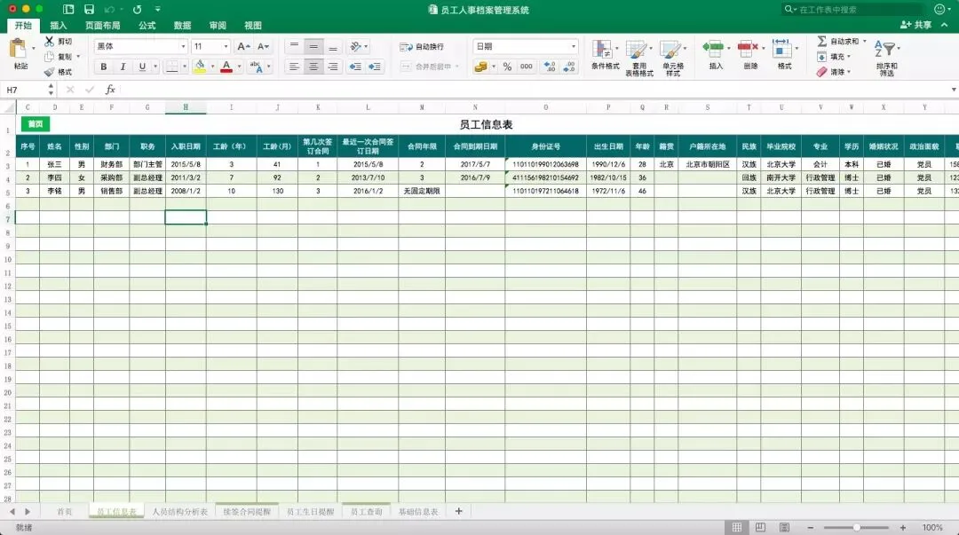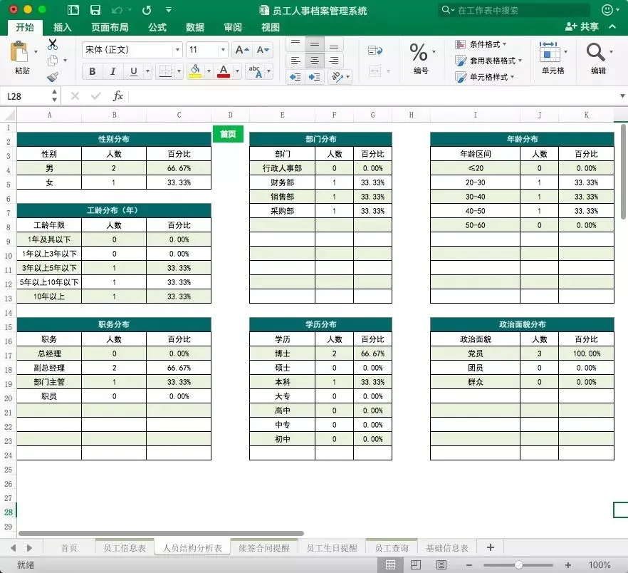 根据员工信息表内容,会自动生成人员结构分析表,包括学历、性别、部门、年龄、工龄等信息。